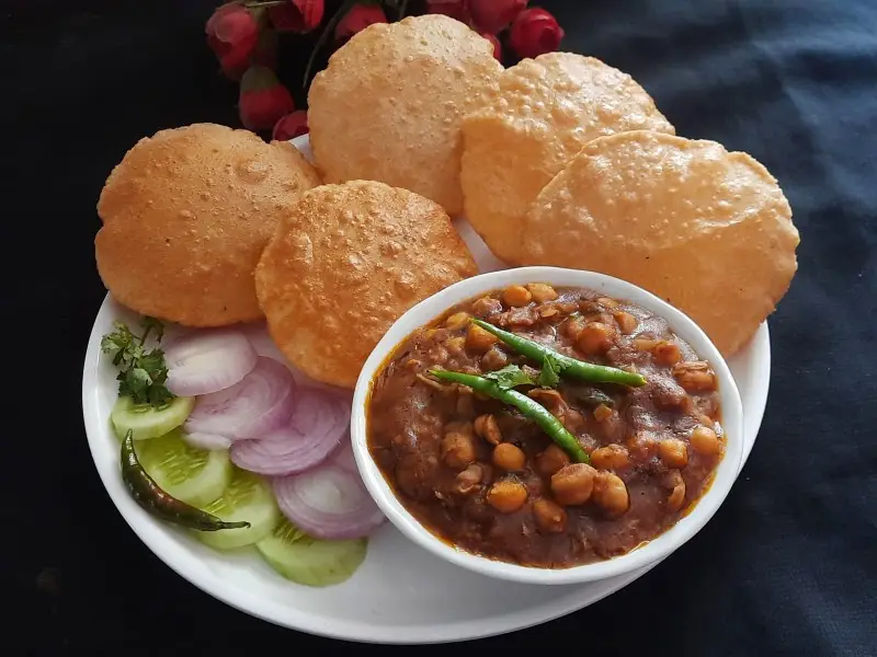 It is a combination of chana masala (spicy white chickpeas) and bhatura/puri, a deep-fried bread made from maida.