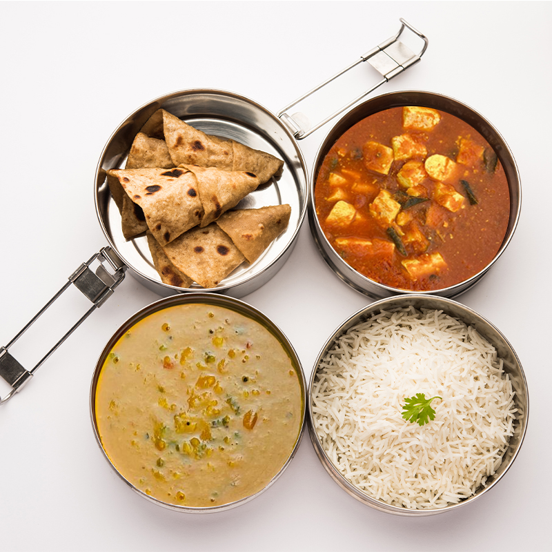 Vegetable + Dal Khichadi / Steamed Rice + Dal + Wheat Chapati/Paratha + Chutney/Salad/Pickle.